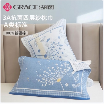 洁丽雅 A类 纯棉 3A抗菌枕巾加大加厚 枕头巾 蒲公英-蓝 一对装