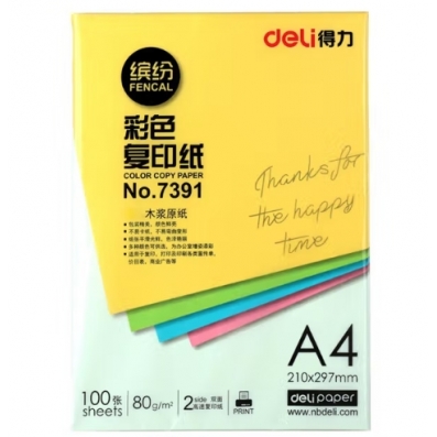 得力 7391-100张 A4 70g 彩色复印纸 彩色打印纸 多色可选
