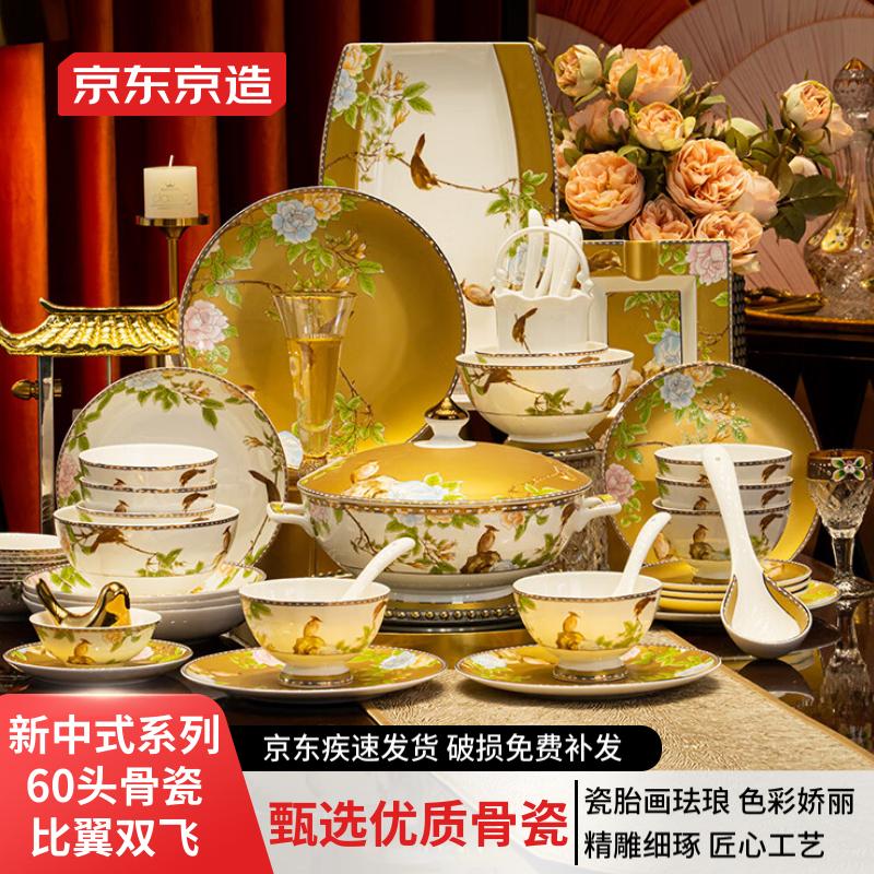 京东京造骨瓷新中式碗碟套装景德镇餐具精选国潮风送礼 60头比翼双飞
