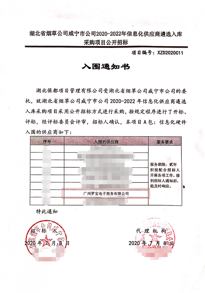 近日,湖北省烟草公司咸宁市公司2020-2022年信息化供应商遴选入库采购项目结果公布,罗宝电商成功中标该项目A包:信息化硬件,入选湖北省烟草公司咸宁分公司供应商库,开启为期两年的采购供应服务。